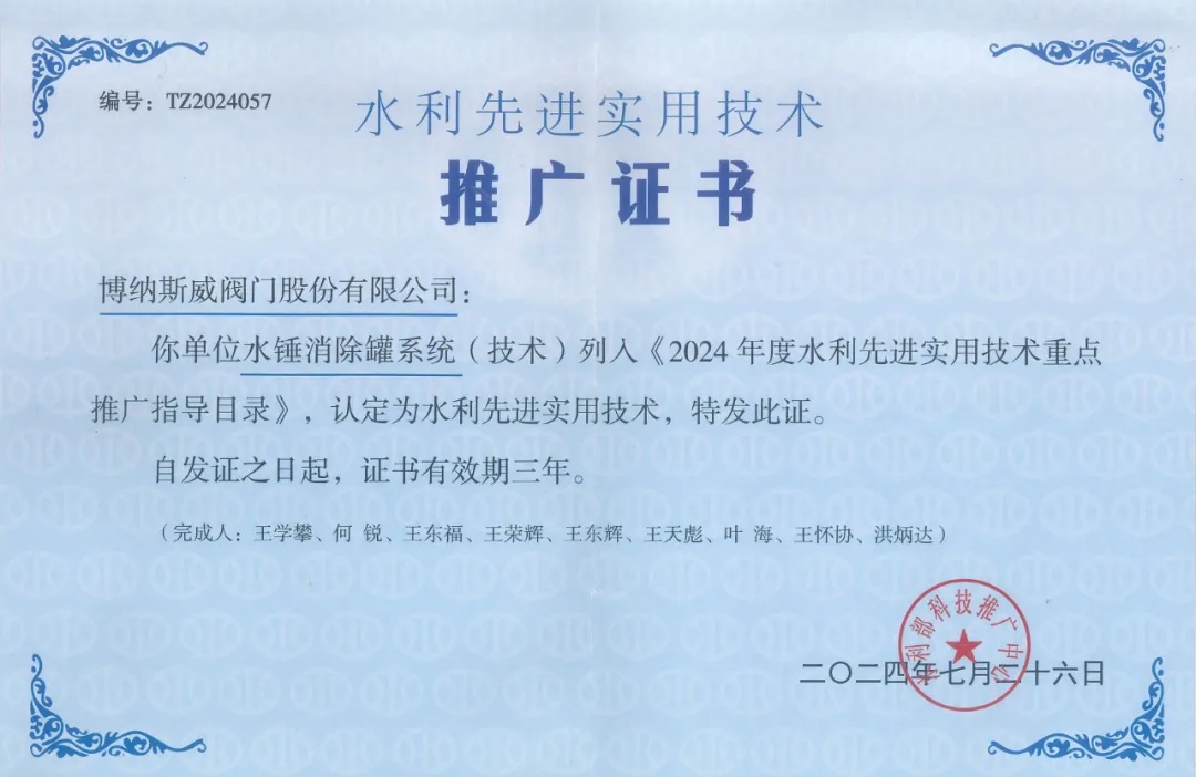 近日,水利部科技推廣中心發(fā)布了《2024年度水利先進實用技術重點推廣指導目錄》,我公司申報的新型技術“水錘消除罐系統(tǒng)”,憑借科學的技術原理、先進的技術性能和良好的應用效益,通過水利部專家嚴格篩選,成功入選該目錄。
