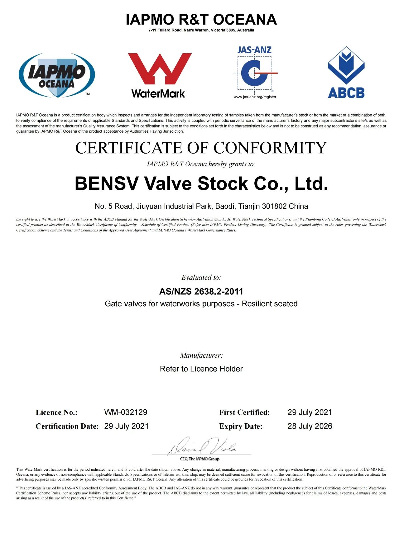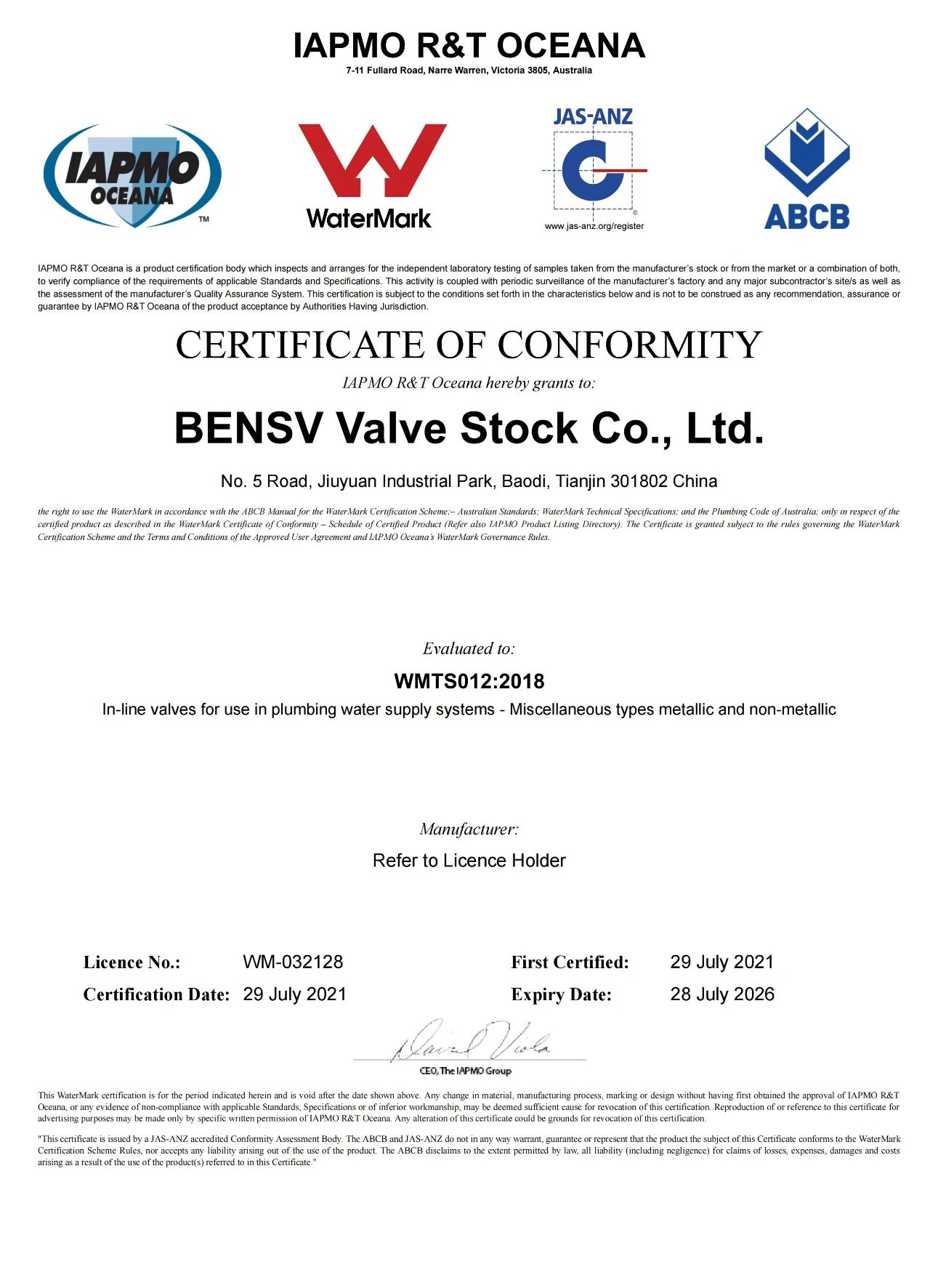 經(jīng)過澳大利亞授權的WaterMark認證機構(gòu)嚴苛檢測和嚴格評審后,博納斯威閥門獲得澳大利亞WaterMark飲用水產(chǎn)品認證。