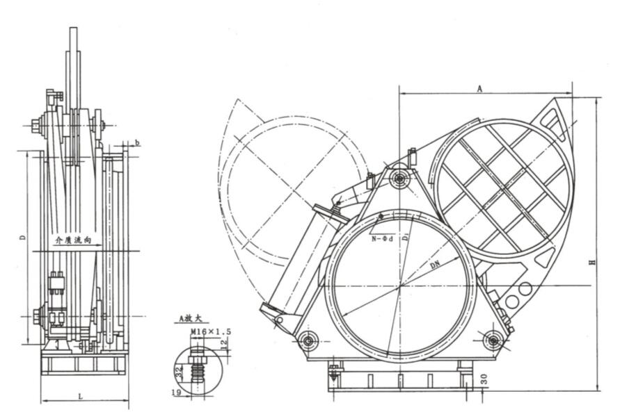 主要由左閥體、右閥體、絲桿、閘板、密封圈、杠桿、汽缸等零件組成,并由底座、支撐柱構(gòu)成一個剛性結(jié)構(gòu)體。閥門中設(shè)有夾緊、松開汽缸和翻板汽缸,夾緊、松開汽缸通過杠桿和絲桿螺旋驅(qū)動左、右閥體完成松開、夾緊動作,翻板汽缸驅(qū)動閘板完成開關(guān)動作。橡膠密封圈鑲鉗在閘板上,具有耐高溫、密封性能好、更換方便、使用壽命長等特點。