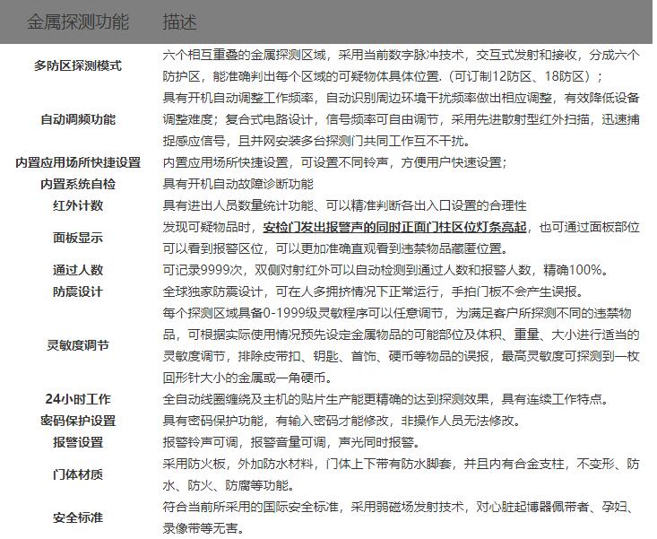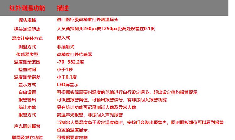 遠(yuǎn)距離高精度人體測(cè)溫安檢門(mén),集帶人體溫度檢測(cè)和金屬探測(cè)為一體的安全檢測(cè)門(mén),門(mén)頭裝有高精度的體溫檢測(cè)探頭,探測(cè)角度可以上下移動(dòng), 能夠測(cè)量人體額頭的表面溫度,然后根據(jù)人體額頭的溫度與體溫的關(guān)系得到人體的實(shí)際體溫。檢測(cè)儀的光學(xué)組件將額頭發(fā)射和反射的能量匯集到傳感器上,通過(guò)電子組件將此信息轉(zhuǎn)化成溫度讀數(shù)并顯示在顯示面板上,當(dāng)溫度讀數(shù)超過(guò)高溫報(bào)警值時(shí),儀器會(huì)發(fā)出報(bào)警聲.報(bào)警溫度可隨意設(shè)置.具有防水、防火、防腐等特點(diǎn)。適用于管制刀具和槍支等危險(xiǎn)品的安全檢查,廣泛應(yīng)用于適用于機(jī)場(chǎng),車(chē)站,出入境檢查站,等人員密集場(chǎng)所。是防止疫情擴(kuò)散的有效手段。